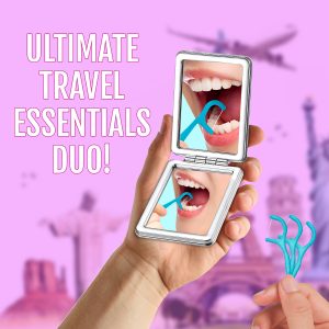 Matra Foldable Hand Mirror & Floss Picks – Dual Sided Makeup Mirror with 2x Magnification – 2-in-1 Dental Flossers with Flossing Thread & Angled Toothpick – Portable Pocket Sized Travel Essentials Kit