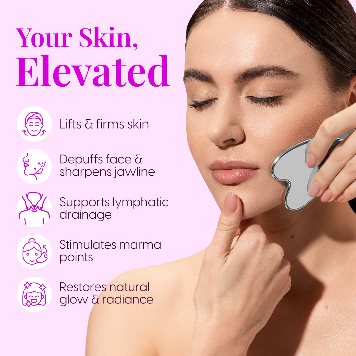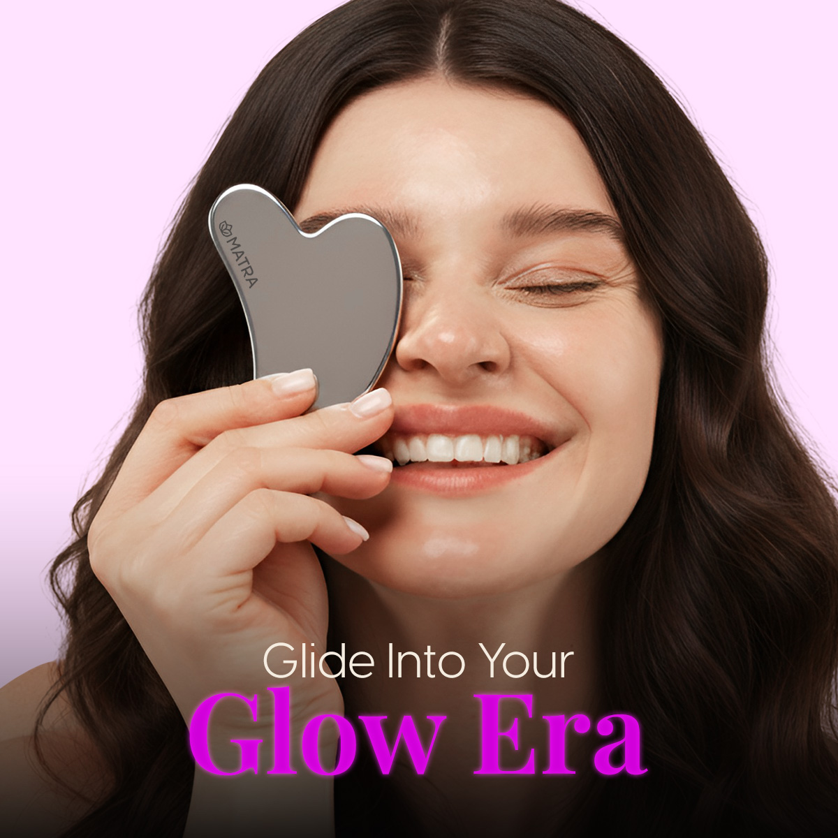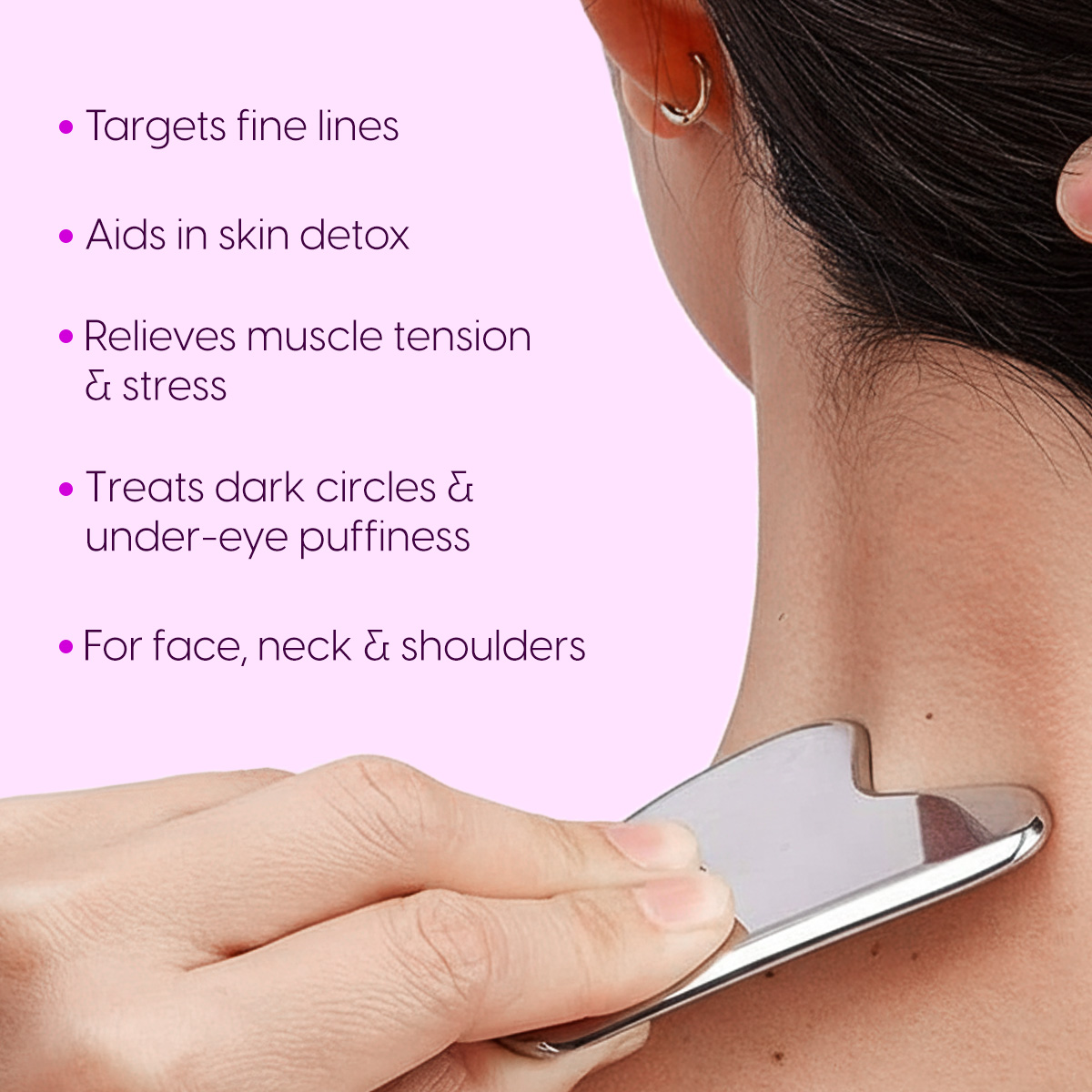 Matra’s Stainless Steel Gua Sha is a modern skincare tool crafted to lift, sculpt, and deliver a natural glow with every use. It works to define the jawline, depuff the face, reduce fine lines, boost circulation for skin that looks and feels its best. Regular use helps stimulate collagen, tighten skin, ease muscle tension, and support lymphatic drainage for a visibly healthier, more contoured complexion. Our gua sha scraping massage tool is durable and hygienic, and is the one tool your routine has been missing.