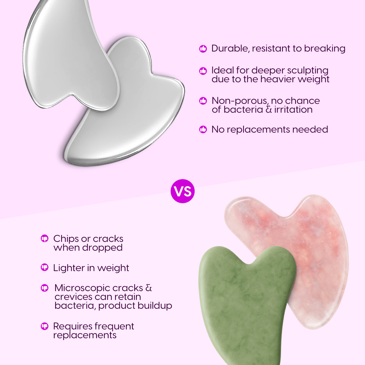 - Stainless Steel v/s Stone: Stainless steel gua sha is durable, resistant to breaking, non-porous with no chance of bacteria or irritation, naturally cool to use, and doesn’t need replacements. In comparison, Stone Gua Sha can chip or crack when dropped, may retain bacteria and product buildup in microscopic crevices, requires frequent replacements, and needs to be chilled before use.