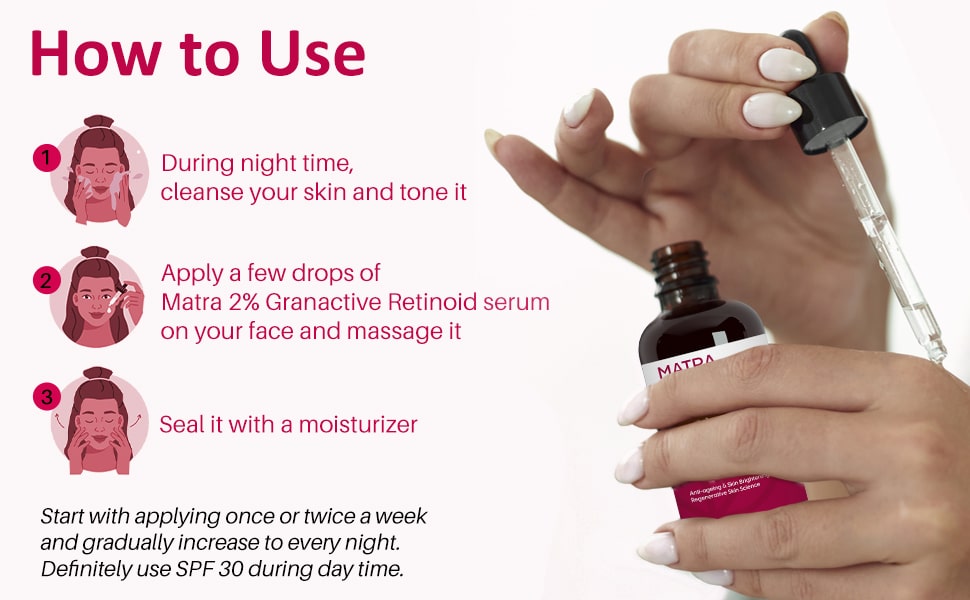 - Apply a few drops of Matra 2% Granactive Retinoid serum on your face and massage it.
