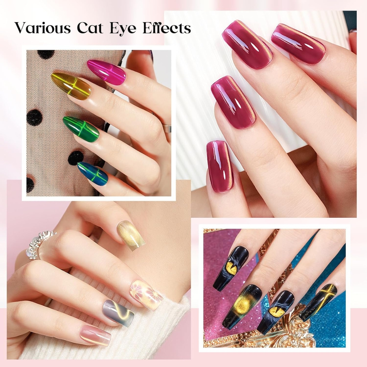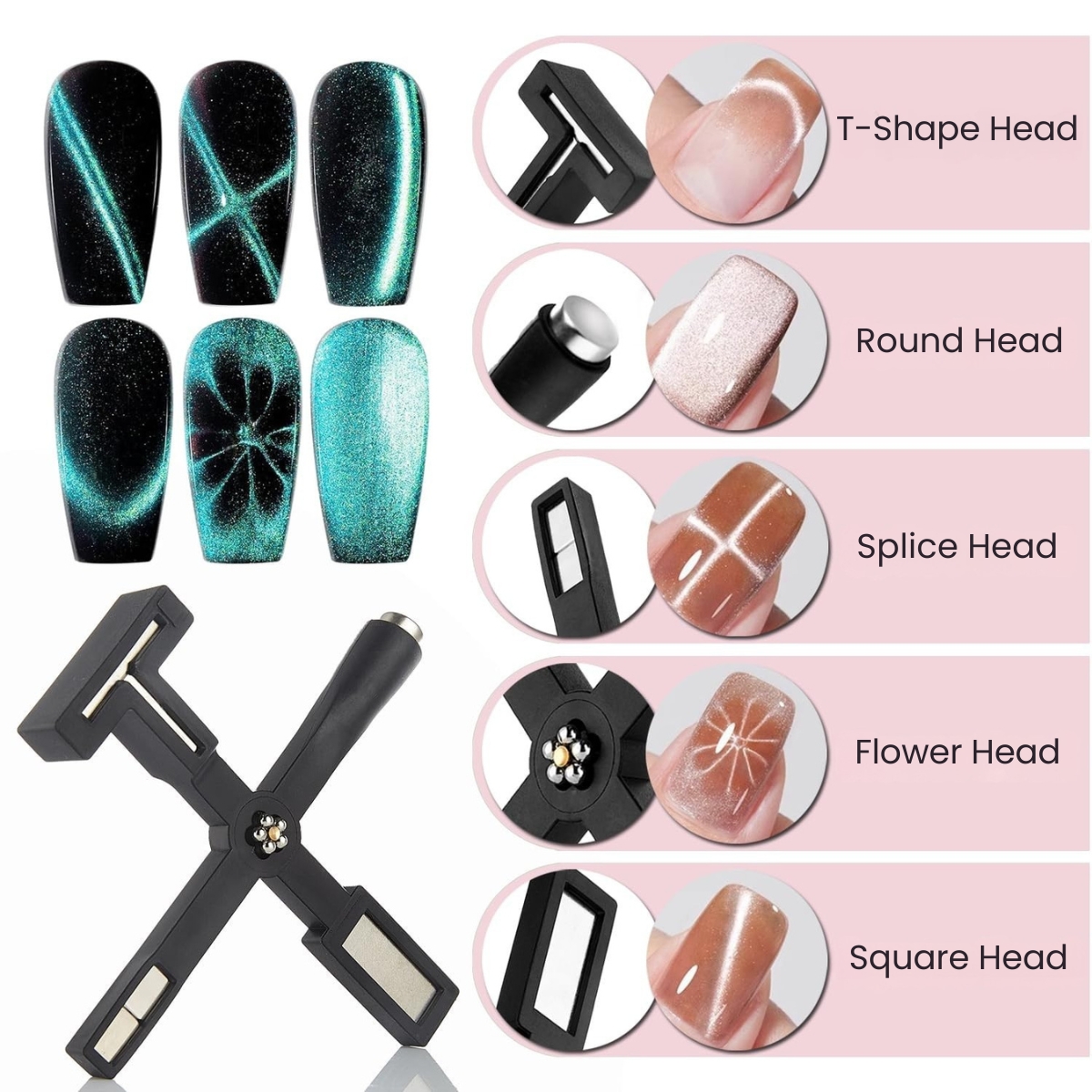 - Versatile 5-in-1 Design for Creative Looks: Our cat eye magnet pen for nail art comes with five unique magnetic heads, making it easy to create a variety of cat eye styles with one tool. From lines, waves, cross, galaxy to velvet nails, glass nails, gradient and ombre effects, this magnet for nail art lets you experiment freely. It’s perfect for switching designs and exploring endless creativity without needing multiple tools.