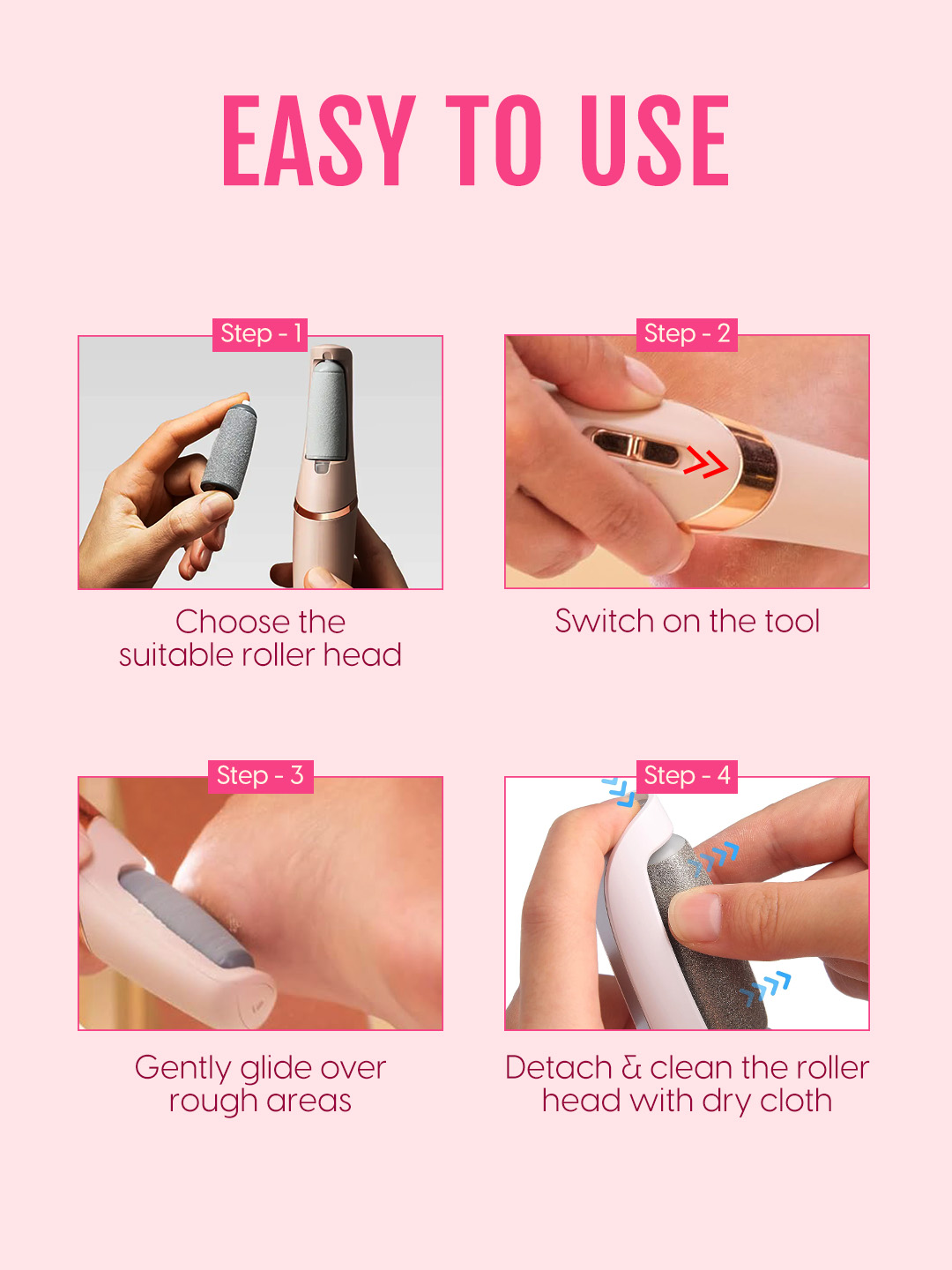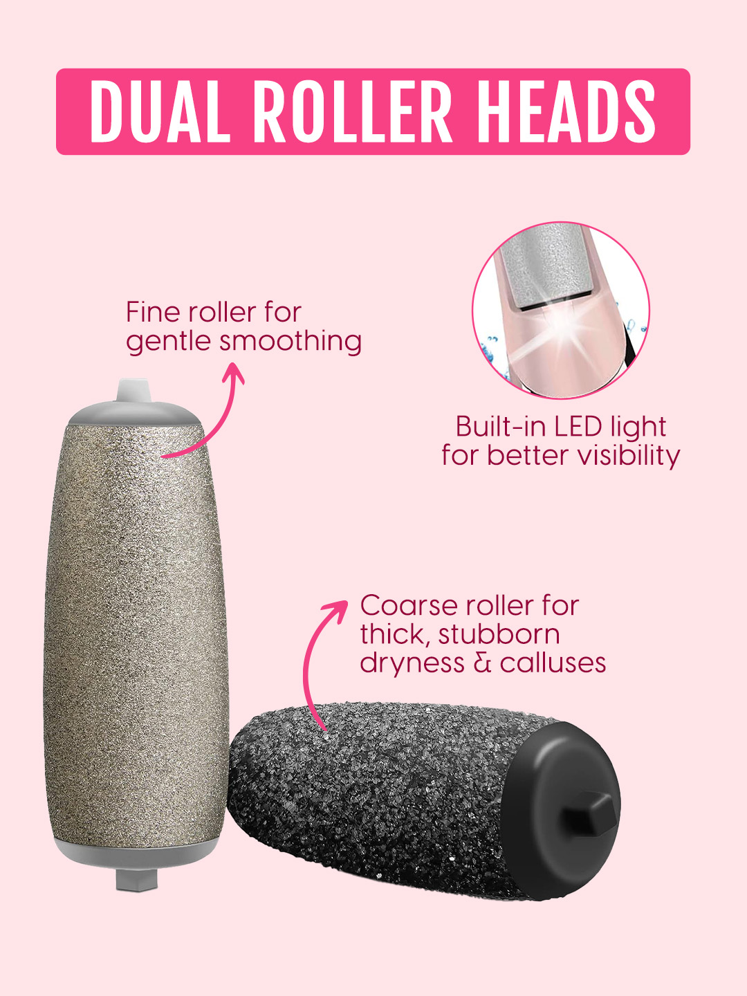 - Dual Roller Heads for Customised Exfoliation: The callus remover foot filer comes with two interchangeable roller heads that adapt to different foot care needs. A fine roller helps maintain smooth skin through gentle exfoliation, while the coarse roller targets thicker, stubborn calluses and dry patches. The electronic callus remover’s dual-roller design meets your feet’s exact needs for a personalized pedicure. The ergonomic handle of the foot filer grinder scrubber ensures a firm, secure grip even with wet or moisturized hands.