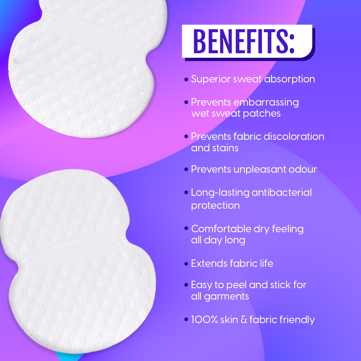 - LONG-LASTING ANTIBACTERIAL PROTECTION: Worry no more about unpleasant odors! Our sweat pads go above and beyond mere moisture control with long-lasting antibacterial protection that actively fights off odor-causing bacteria. Even during the most demanding activities, these anti-stain sweat pads ensure that your underarms stay dry and clean ensuring you’re always at your best.