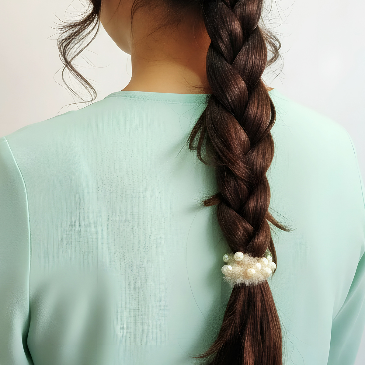 - Wrap the pearl hair scrunchie around the hair once or twice, depending on the thickness.
