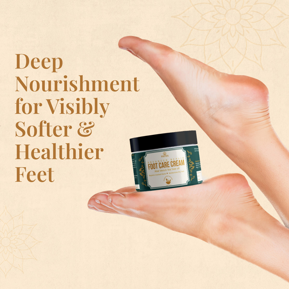 Matra?s advanced repair foot care cream infused with aloe vera, tea tree and vitamin E is the best foot cream to repair cracked heels, hydrate dry skin and to soften calluses. Our intense foot cream formulated with natural ingredients treats corns and blisters, removes dead skin, relieves foot pain, softens hard skin and feet, treats feet and ankle cracks and protects the skin from getting rough and damaged. Matra’s foot cream is also effective in feet tan removal and whitening.