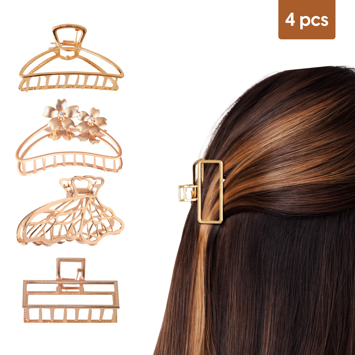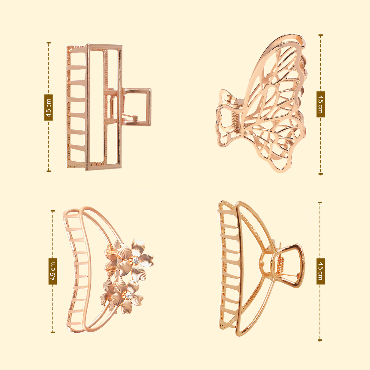 - Multiple Design Options: This set of hair clutchers includes a mix of small golden claw clips, geometric hair clips, a butterfly hair claw clip, and a flower hair clutcher, giving you multiple looks in one pack. Each design adds variety without overcomplicating styling. These metal hair clutchers are super easy to match with different outfits and moods.