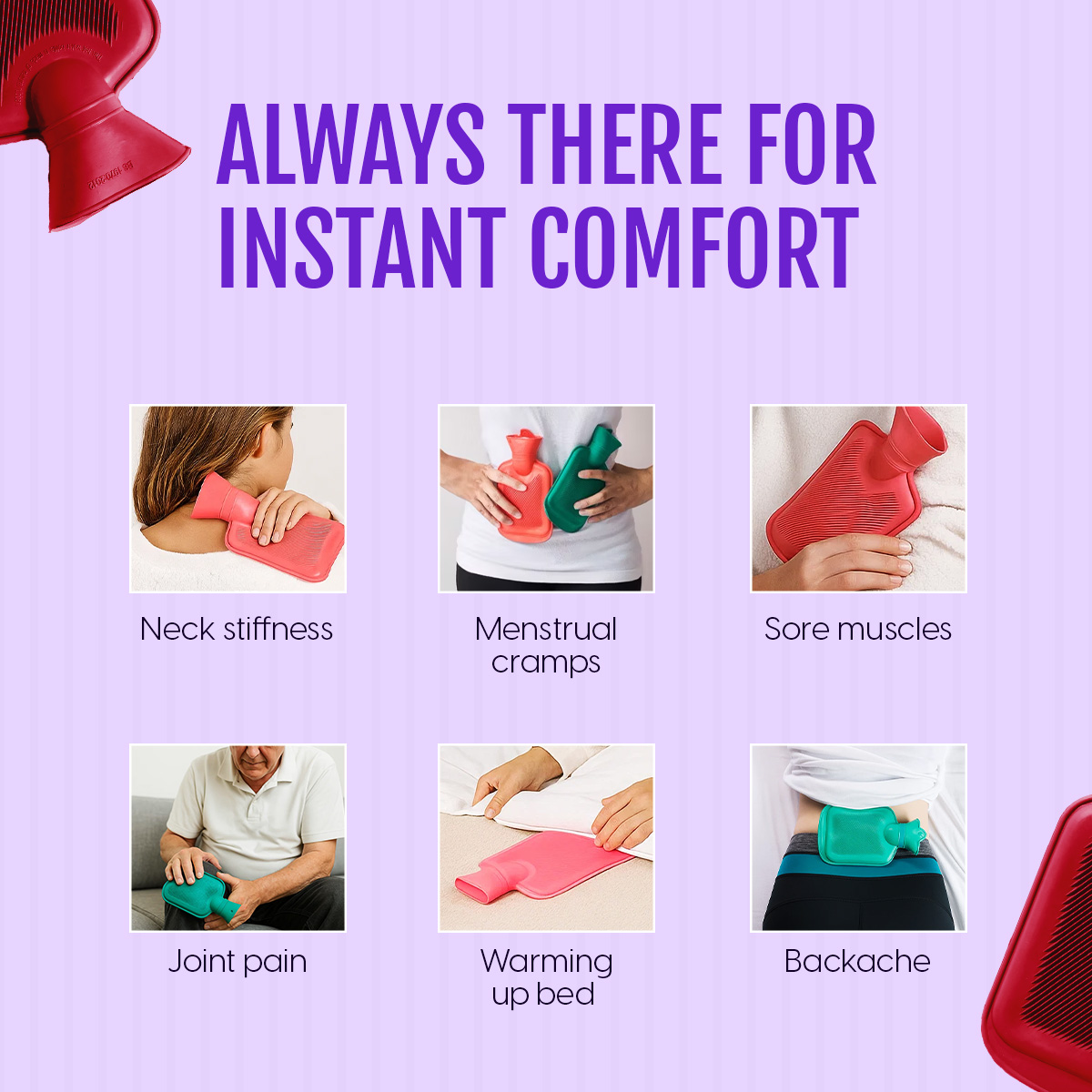 - Pain Relief: This hot water bag’s soothing heat therapy provides relief from all sorts of pain, like period cramps, muscle soreness, leg cramps, sinus-related facial tension, backache, hypothermia, neck stiffness, physiotherapy, sprains, sports injuries and joint pain. The hot water pack is also ideal for warming up in chilly weather. The ribbed exterior helps prevent skin burns and allows longer heat retention, ensuring safe, steady warmth.