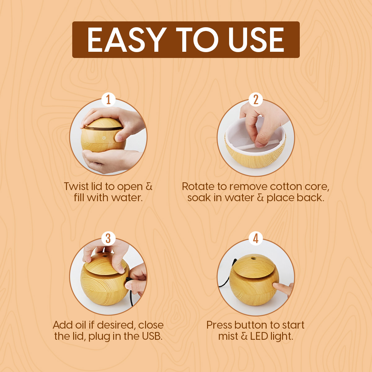 - EASY TO USE: Twist the lid to open the water reservoir, remove the cotton core, and soak it in water for about a minute before reinstalling it. Add purified water and a few drops of essential oil, then close the lid securely. Connect the humidifier with LED light to a USB power source and press the touch button to start.