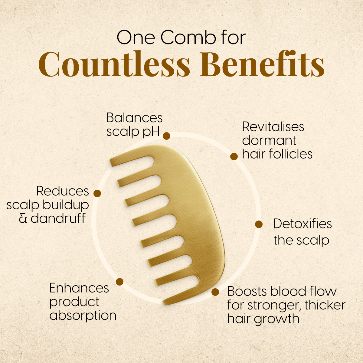 - Healthier Scalp: Matra’s kansa hair comb has alkaline properties, assisting in balancing the pH of your scalp. Kansa metal is also known to draw out toxins. Coupled together, this allows a healthy environment for the follicles, thereby treating scalp issues such as dryness, oily scalp or dandruff. Our kansa comb for hair growth exfoliates the scalp to remove buildup of dead skin cells, oil and products, allowing it to breathe.