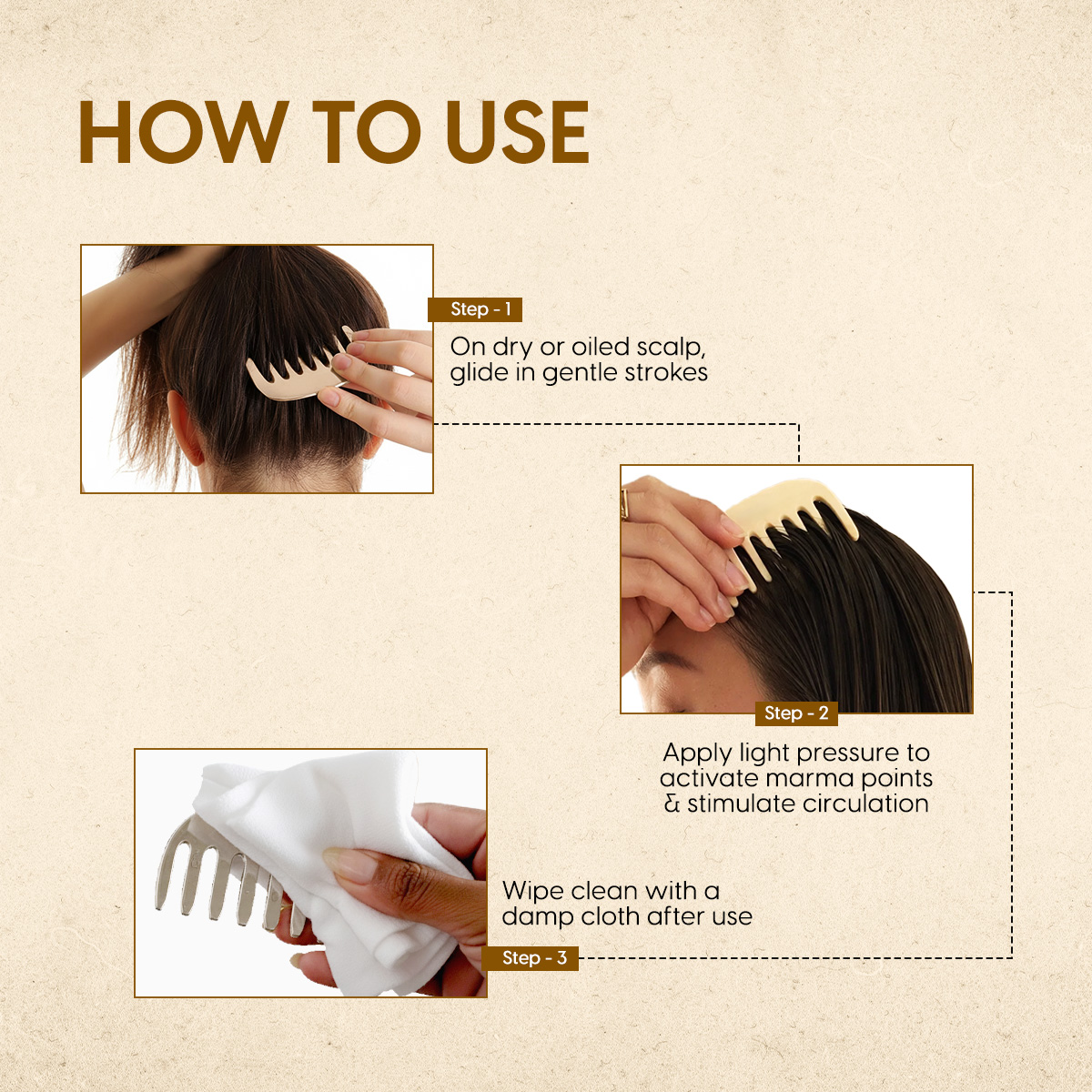 - Healthier Hair Growth: Massaging the scalp with our Ayurvedic kansa head massager for scalp boosts blood circulation. This enhanced blood flow provides essential nutrients to the hair follicles which in turn encourages hair growth of thicker, stronger, shinier strands. Regular usage of the Kansa scalp massager for hair growth revitalises even the inactive follicles for hair regrowth.