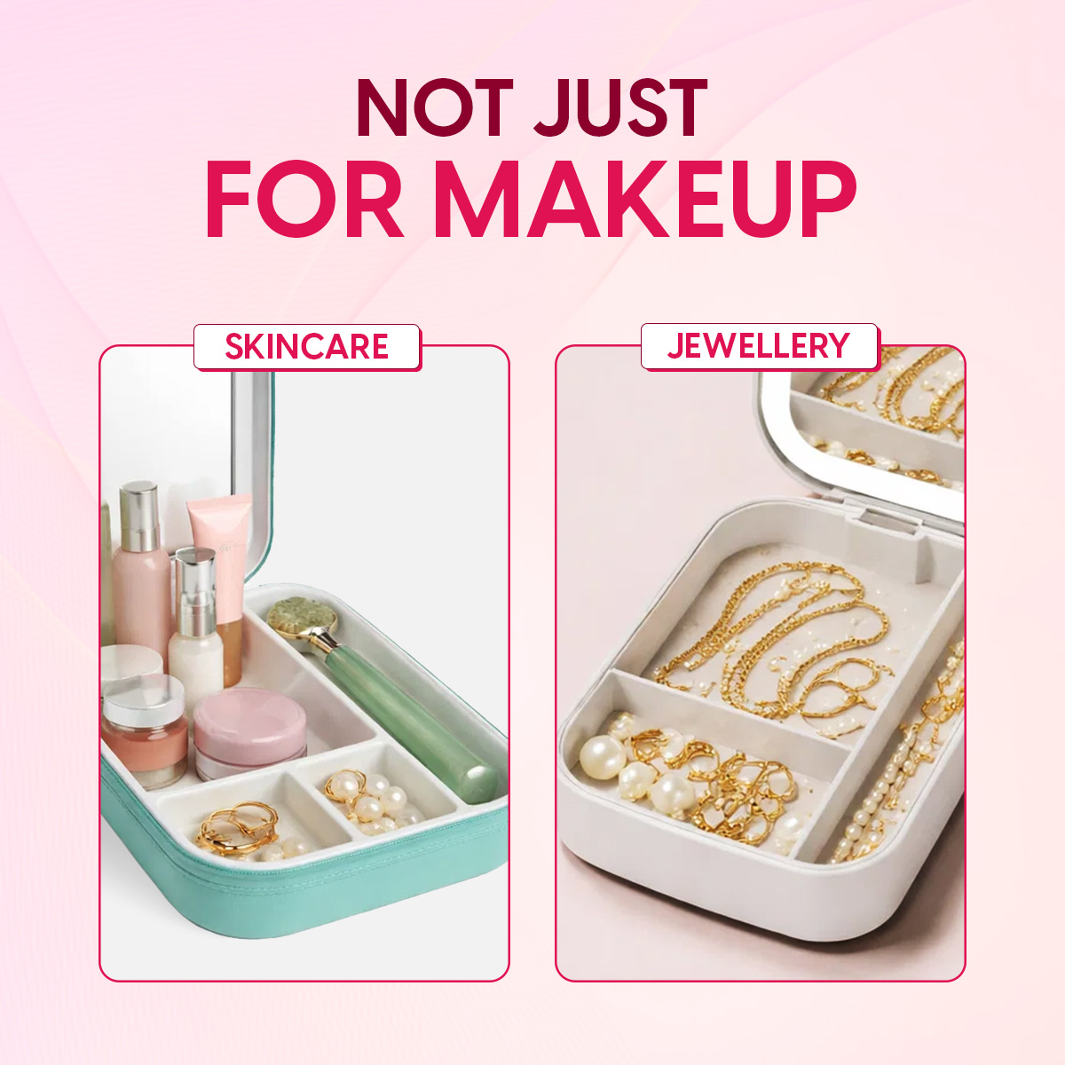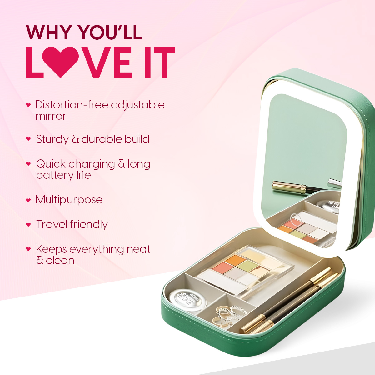 - Versatile & Multipurpose: Not just cosmetics, this all-rounder cosmetic box with light mirror can also store your precious jewellery! Rings, bracelets, earrings, necklaces, pendants, you name it all! Your accessories will remain free of tangles with the help of this travel makeup bag’s dedicated compartments.