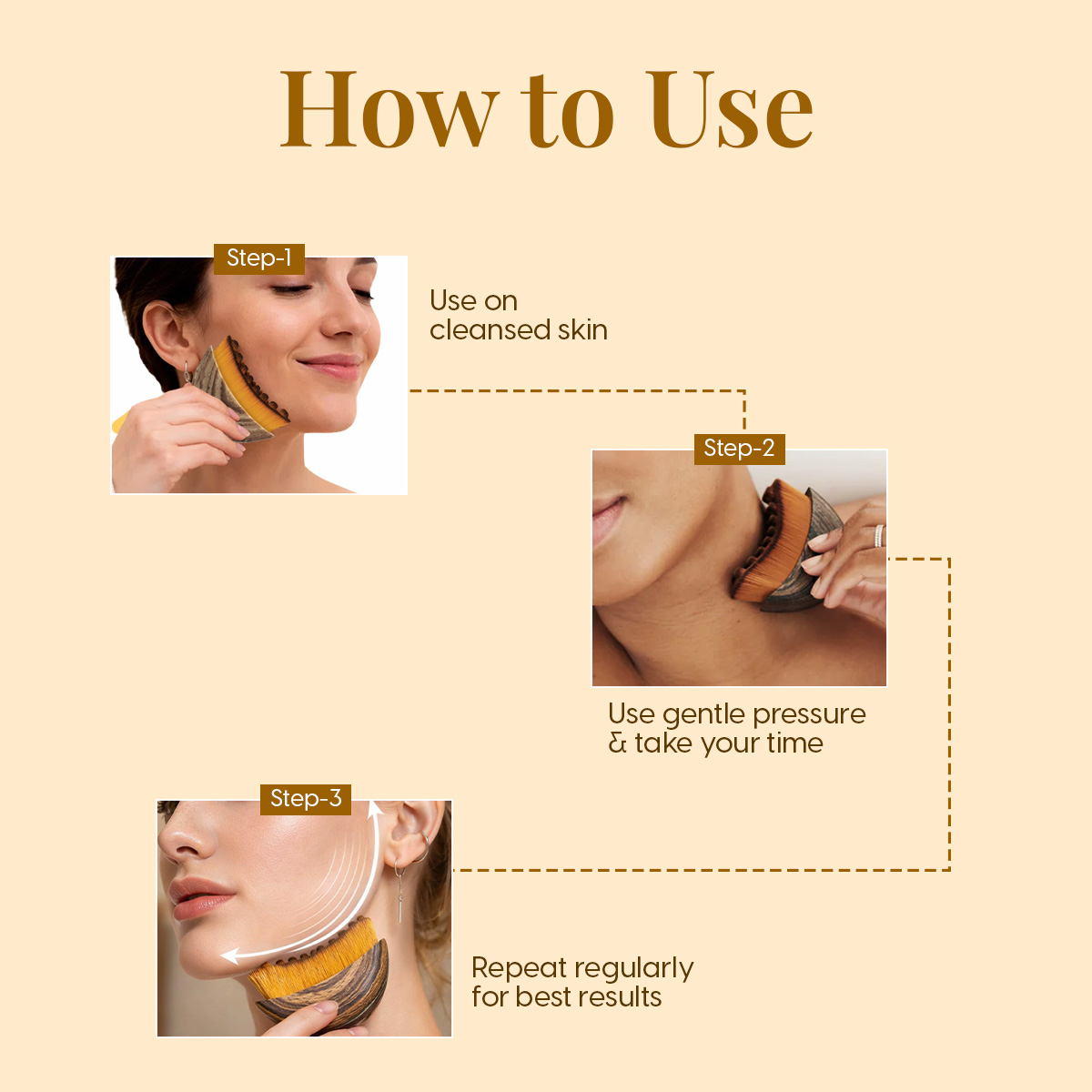 - Use slow, light strokes along the jawline, cheeks, and forehead