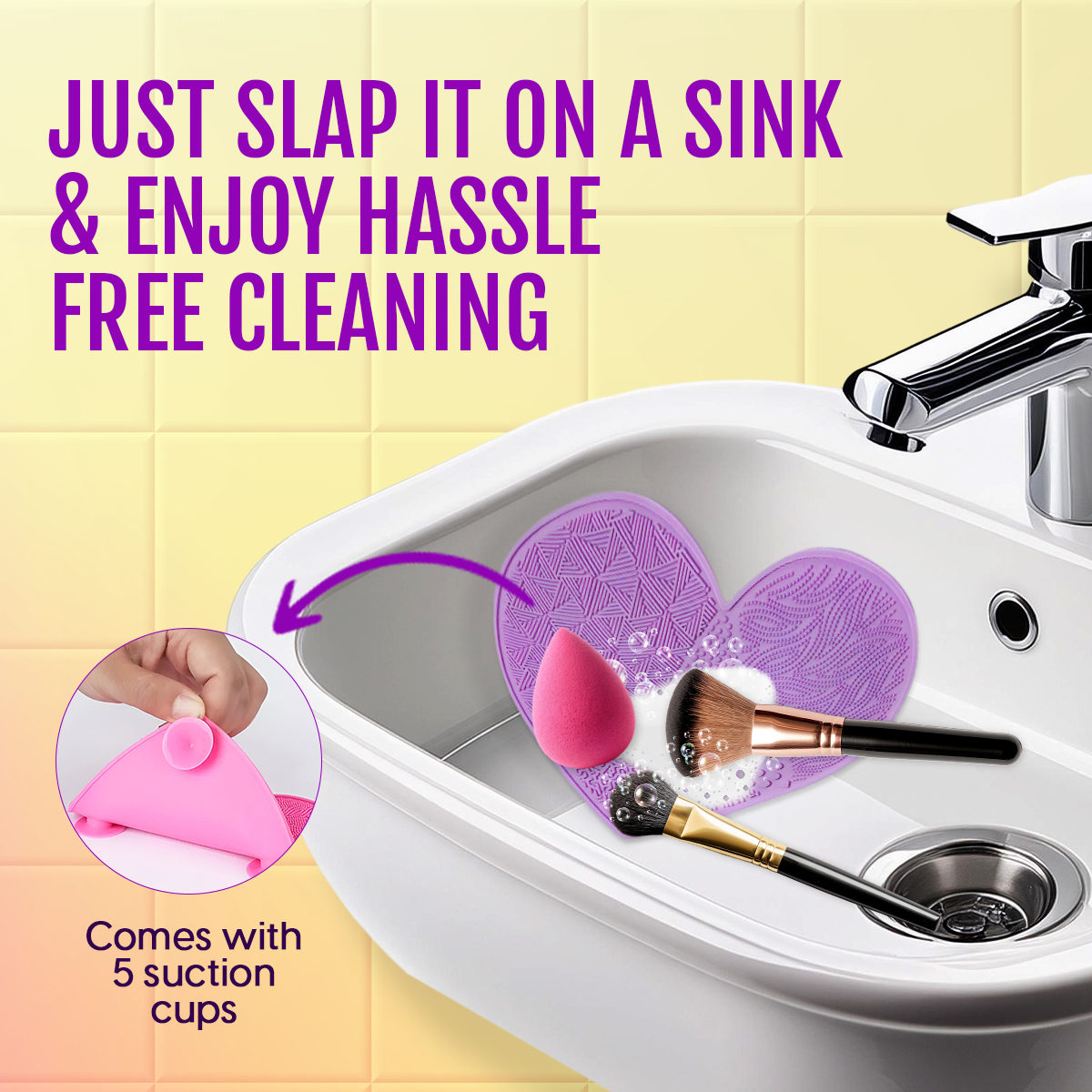 - SUCTION CUP: Equipped with 5 strong suction cups underneath, this silicone makeup brush cleaner pad can be securely attached to wash basins or sinks, allowing quick and convenient cleaning.