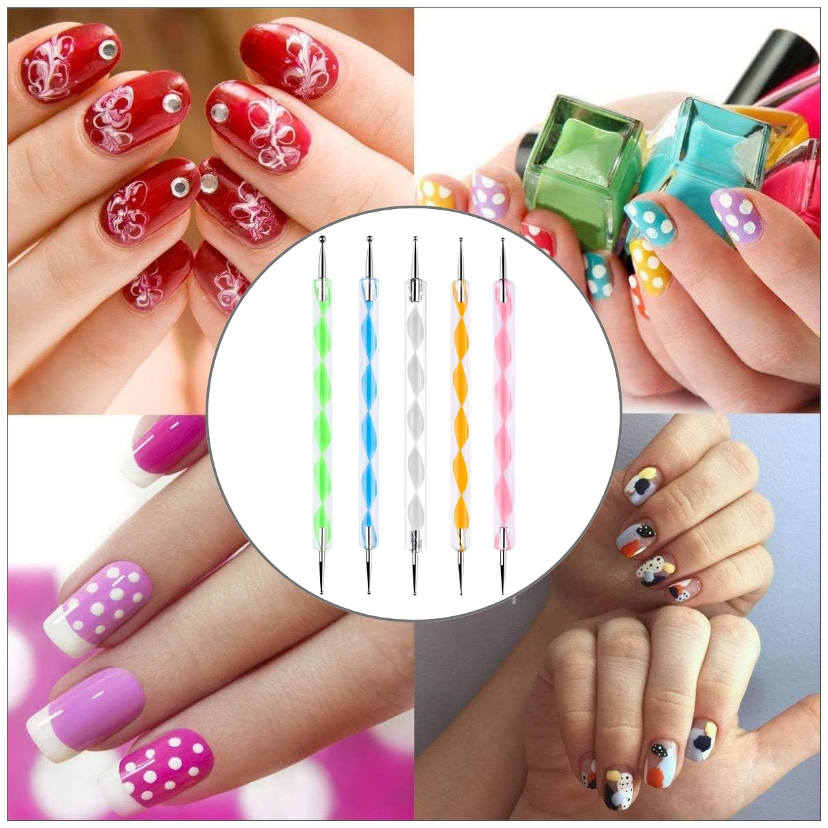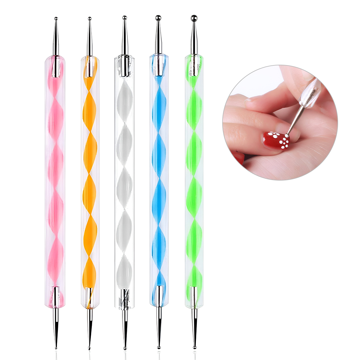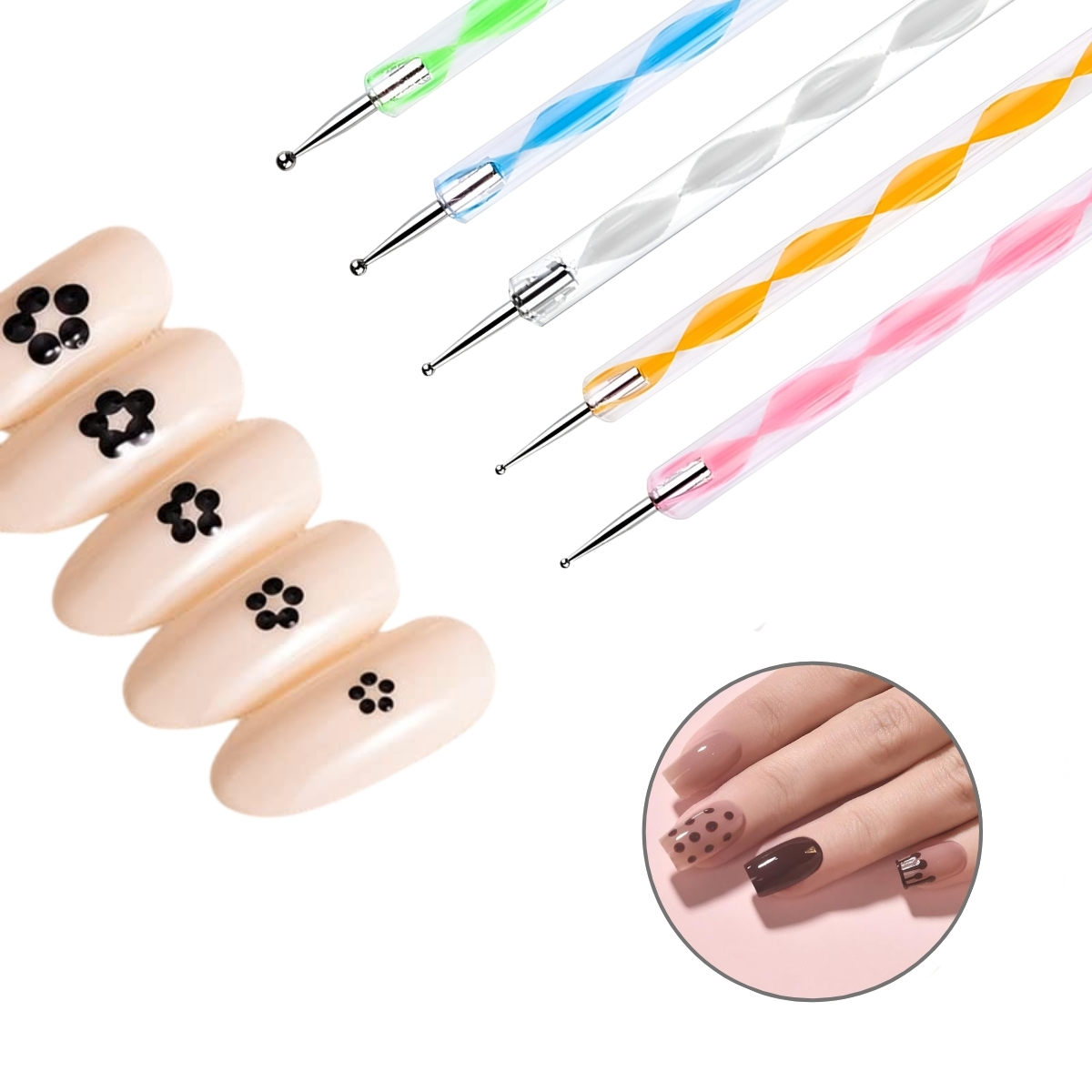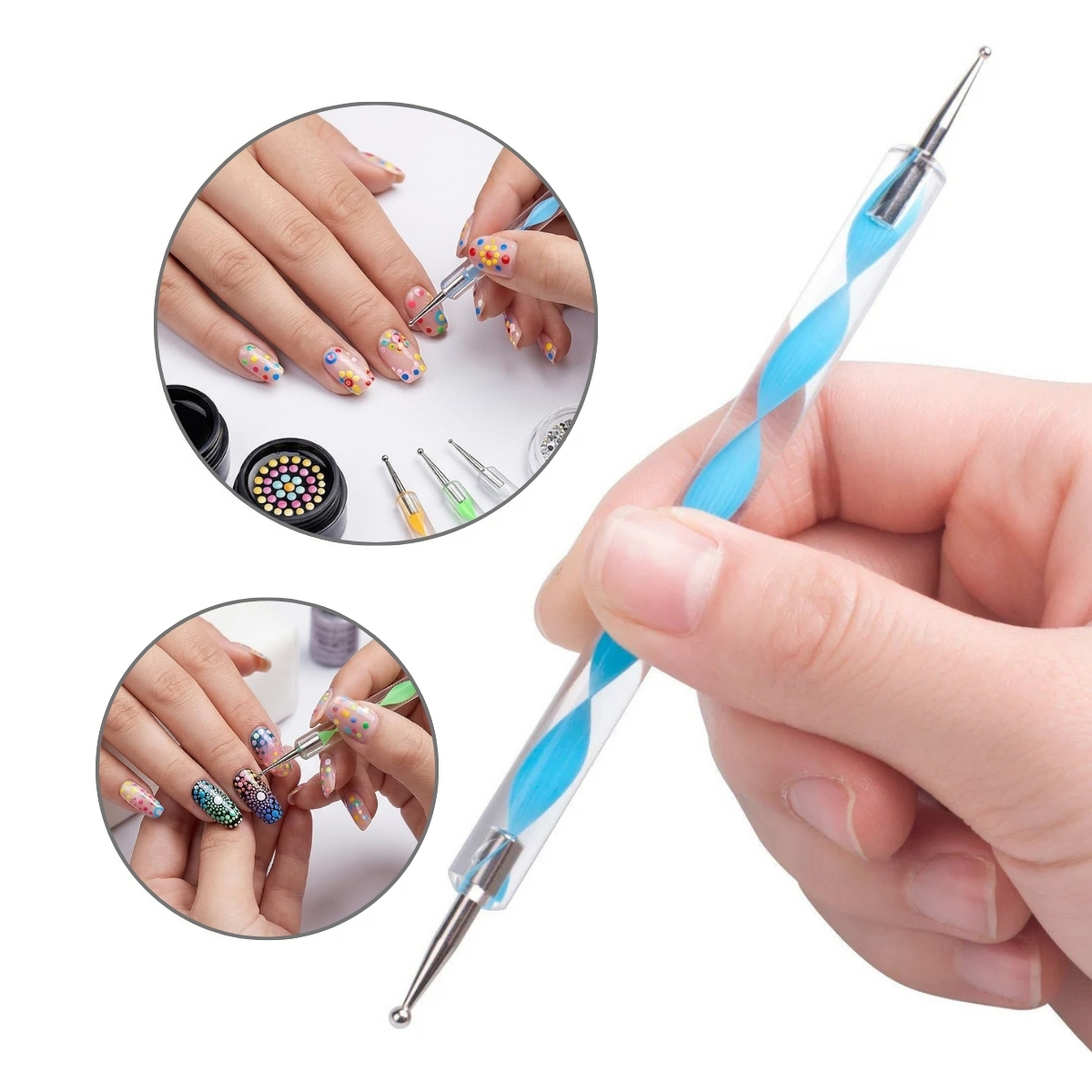 - Double-Sided Nail Art Doodle Pens: Every nail art dotting pen in this set features two different tip sizes, rounded and pointed, allowing you to create tiny accents, groovy patterns and bold decorative dots using a single set. This practical nail art dot pen format makes it easy to switch between styles while designing patterns, floral elements, or marble effects using the marbleizing tool for nails.