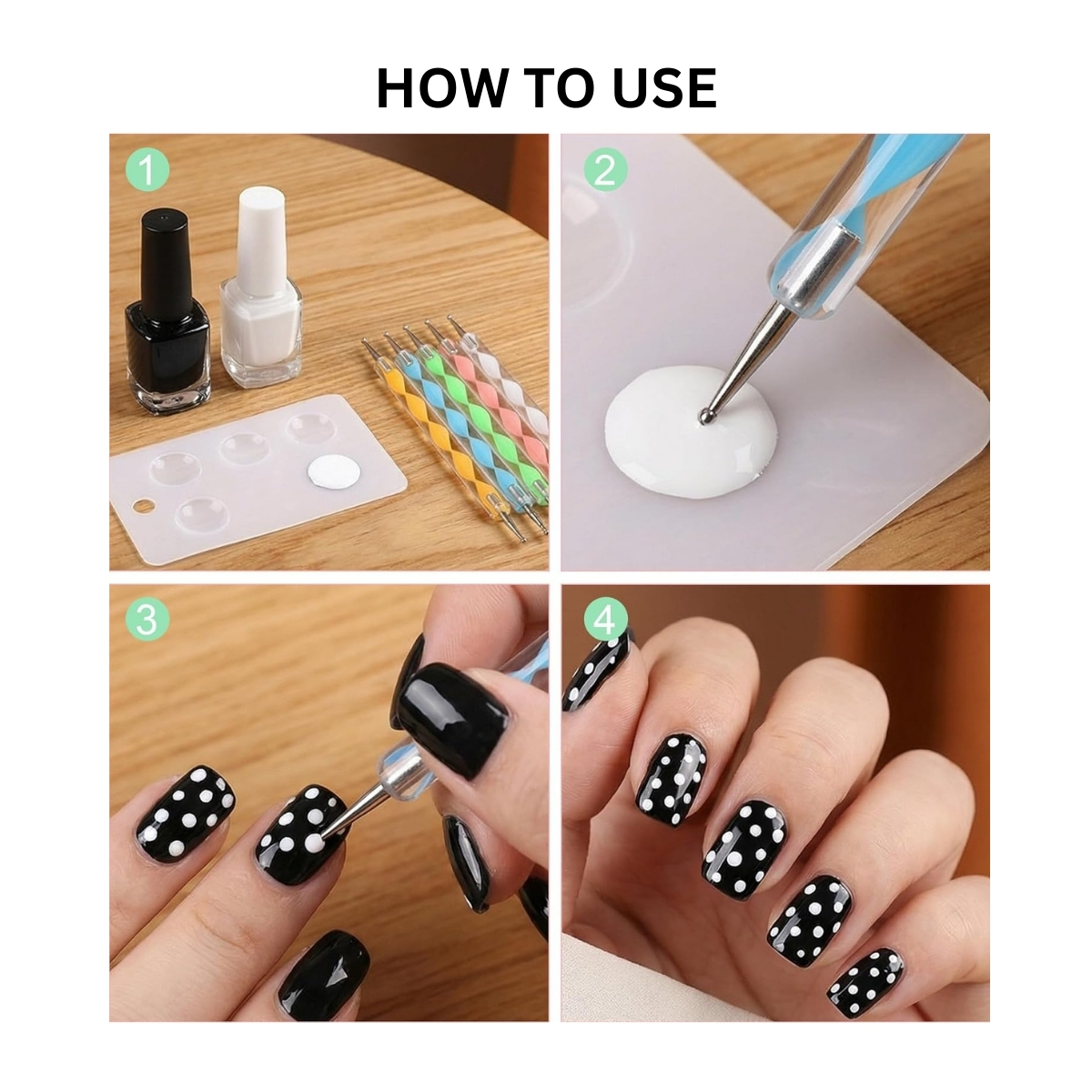 - Use the different tip sizes from the nail art tools to achieve varied dot sizes and intricate details.