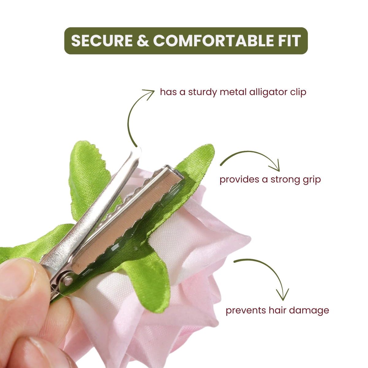 - SECURE & COMFORTABLE FIT: Designed with a sturdy metal alligator clip, this hair accessory firmly holds the hair in place without slipping. Whether for thick, curly, or straight hair, our rose hair pin provides a strong grip while ensuring comfort, preventing hair damage or discomfort even with prolonged use.
