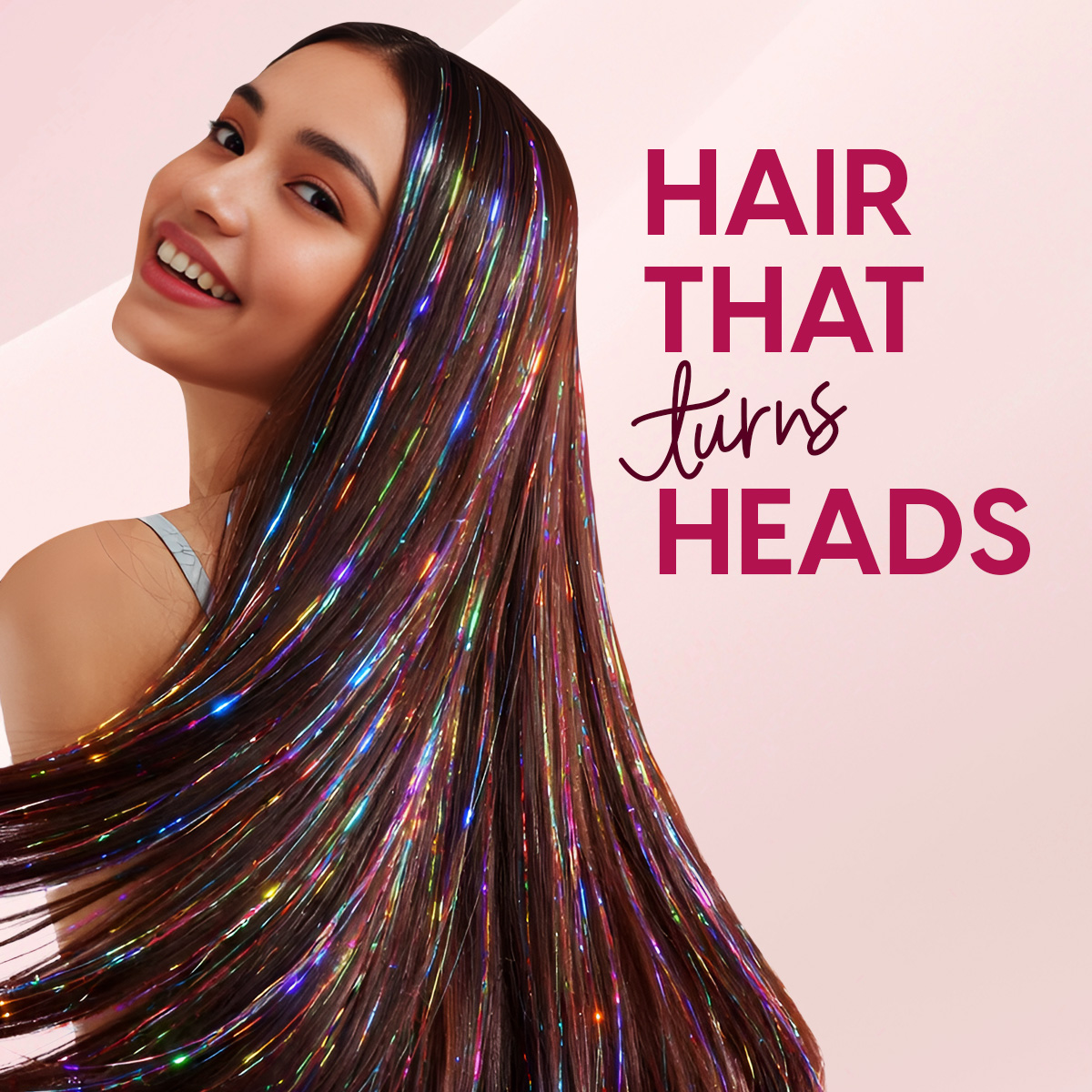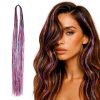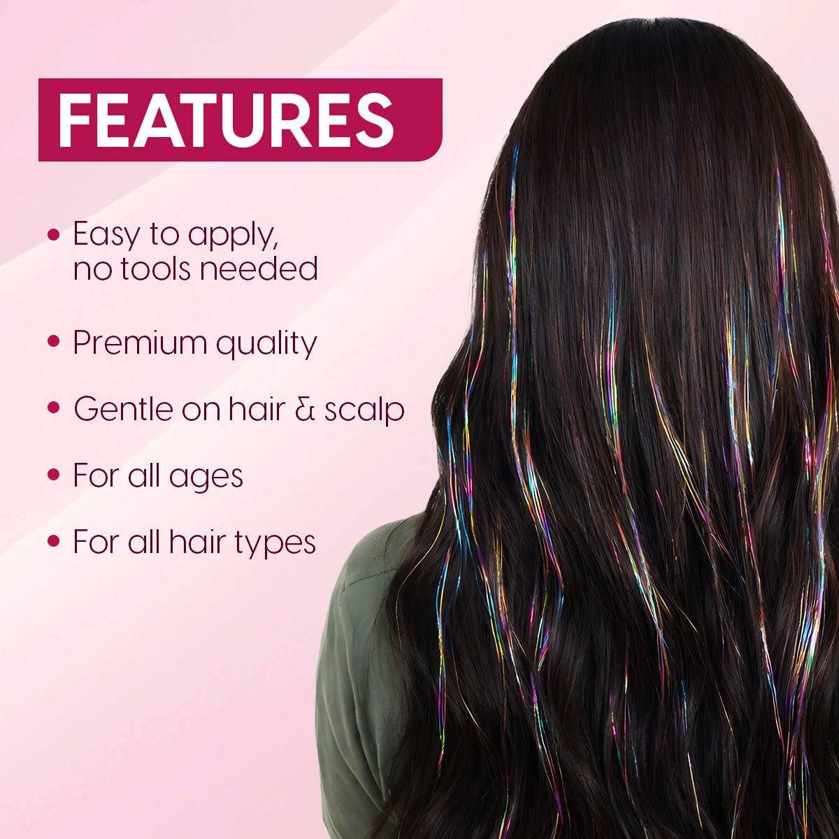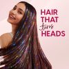 - No Tools Needed & Gentle Removal: Fold a single tinsel strand in half (or slightly off-center for longer hair) to create a loop. Take a small section of hair near the scalp, from one layer below the top, for a subtle look. Place the loop behind this section, insert your finger through the loop, grab the tail ends, and pull to tighten it near the scalp. Now, tie a knot with each loose end of the tinsel once with the hair section to secure it. To take off the sparkle hair extensions, simply drag the knot towards the end of your hair. Yanking on the tinsel will make the knot tighter. (Note: it is recommended to use heat protectant before heat styling).