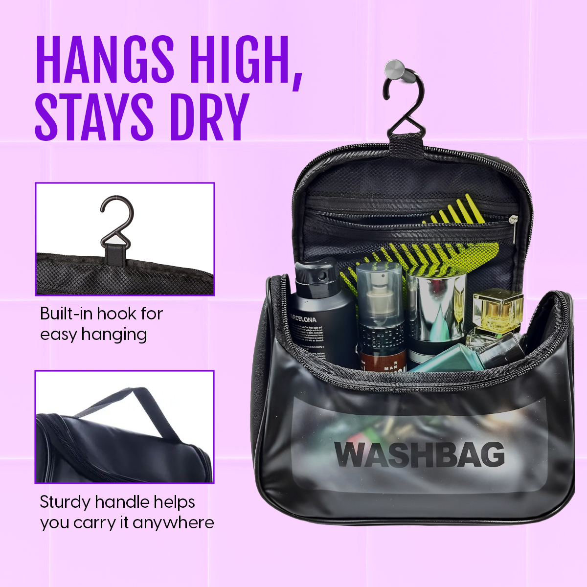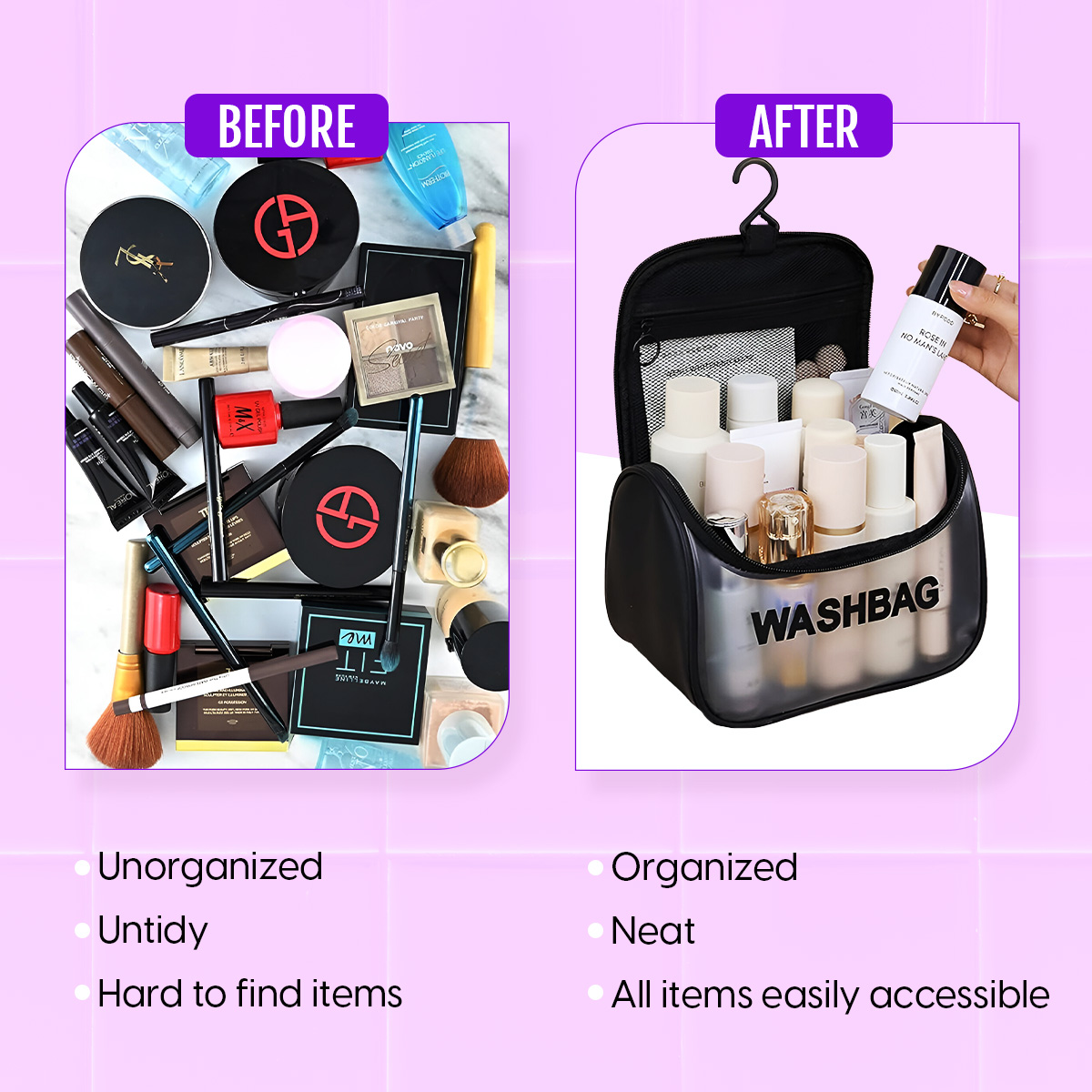 - COMES WITH A HOOK AND HANDLE: Save your counter space! This washbag pouch features an in-built hook using which the vanity bag can be hung from any door hook, bathroom rod or towel rack. With its sturdy strap handle on the top, our makeup pouch can be held and carried around with ease.