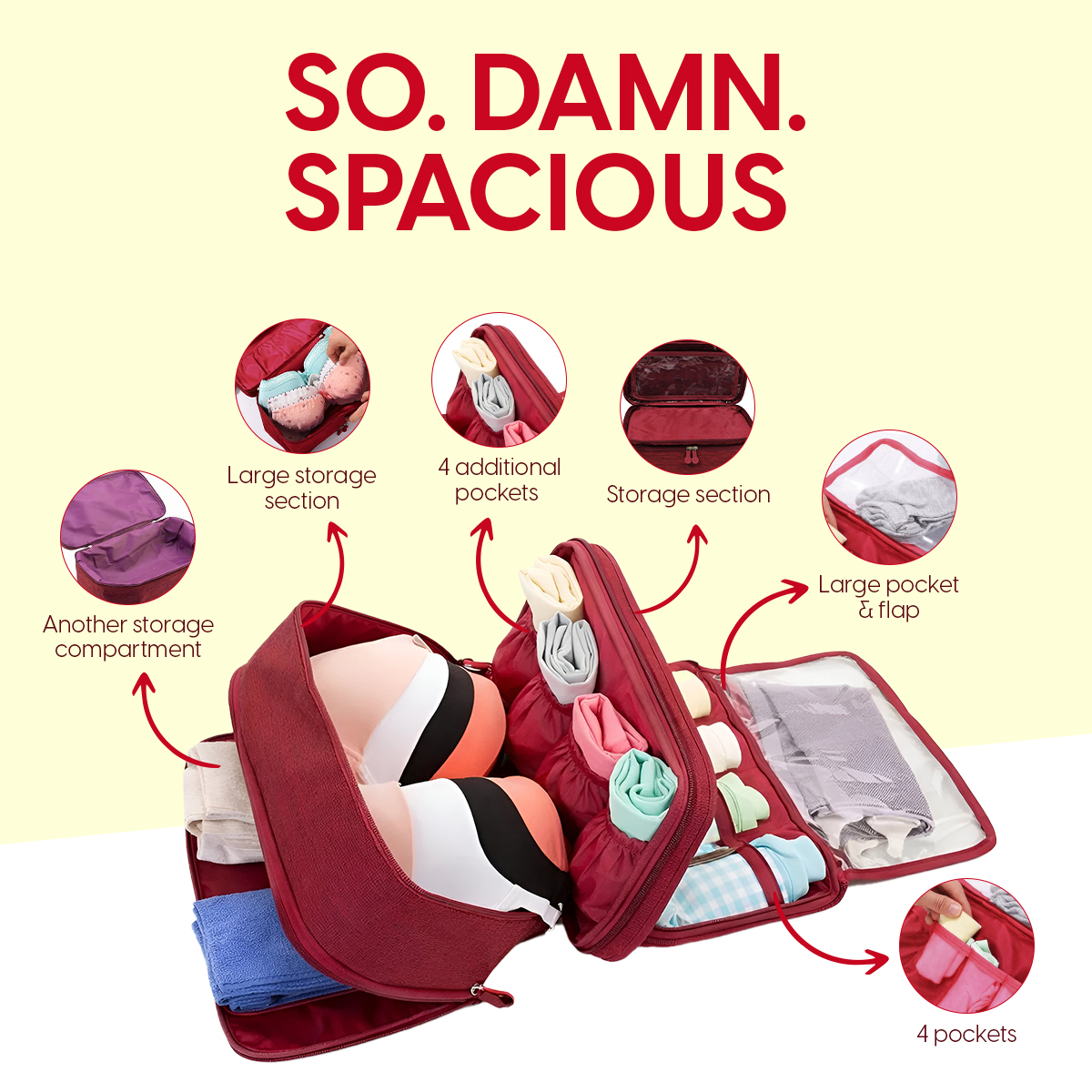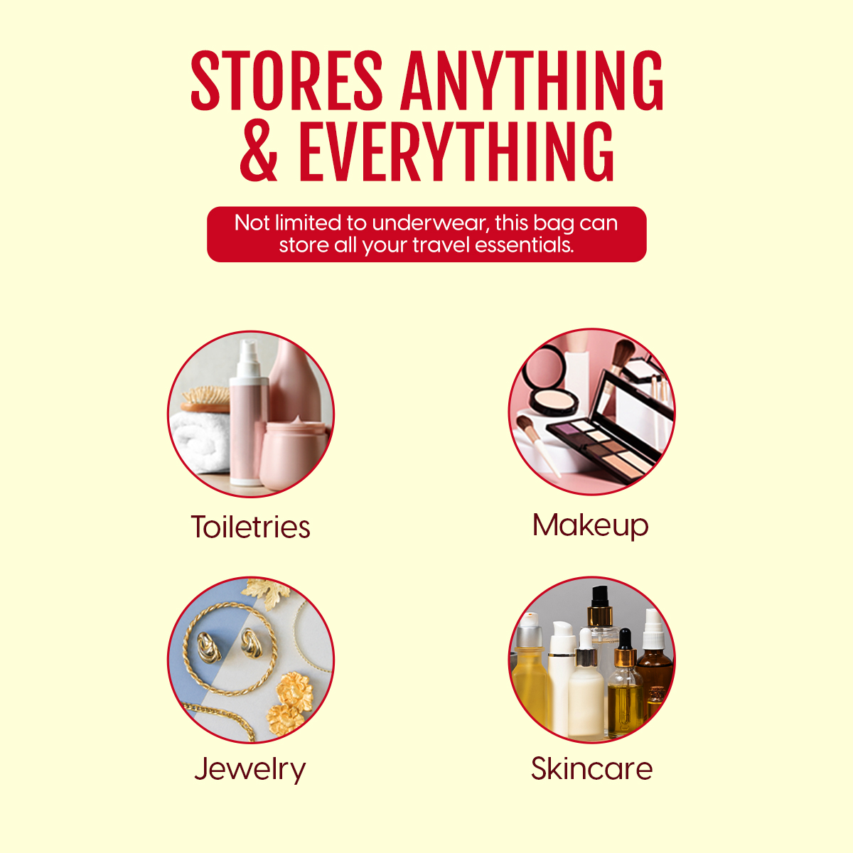 - Multipurpose, Versatile & Travel-Friendly: Our socks and underwear organizer for travel is highly adaptable. It can store your makeup, cosmetics, toiletries, skincare, electronic cables, hand towels, medicines, accessories, and so on. Use it as a gym bag, shaving kit pouch or vanity bag, this undergarments bag keeps ‘em all in place. It’s perfect for business trips, vacations, weekend getaways, and even home storage. Our innerwear organizer doubles as a practical gift that your friends and family will actually use instead of just passing it on.