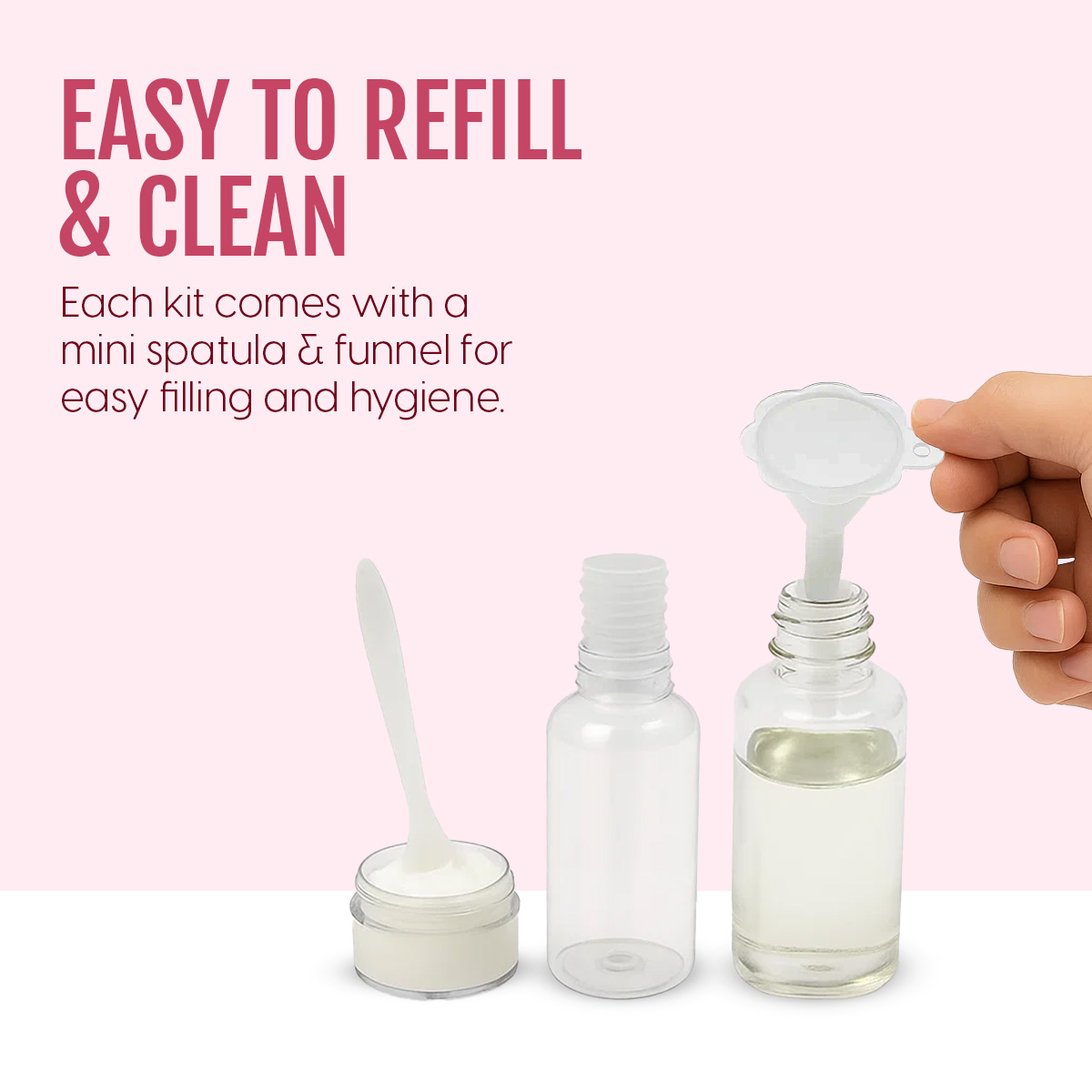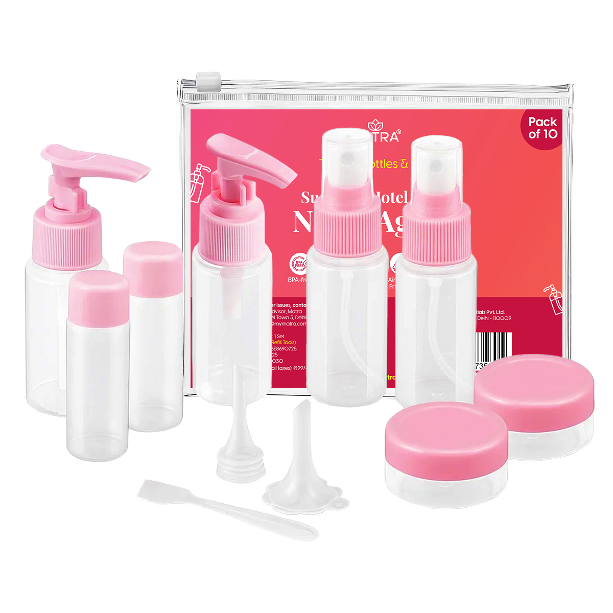 Keep all your skincare & toiletries organised in one place with Matra Travel Size Bottles & Jars. Enjoy a mess-free makeup or skincare application with our leakproof and spillproof travel containers. These containers are well within the air travel limits, so you can travel with style and ease. All travel bottles are designed with wide mouths for easy cleaning and refilling. This set also comes with a funnel, spatula, and pipette dropper, so you can refill anytime, anywhere. Made from premium BPA-free material, the bottles are safe, durable, and built to last. Compact and stylish, the kit slips easily into any travel bag and comes with free labels and a waterproof carry pouch to keep everything in place.