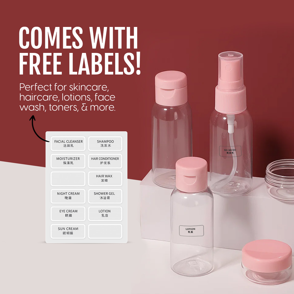 - Free Labels & Carry Pouch: Our toiletry containers travel kit also includes free labels, which enable you to identify your toiletries easily, without any guesswork. The transparent waterproof zip lock pouch holds all the refillable toiletry bottles and refill tools, so you don’t have to rummage through your luggage.